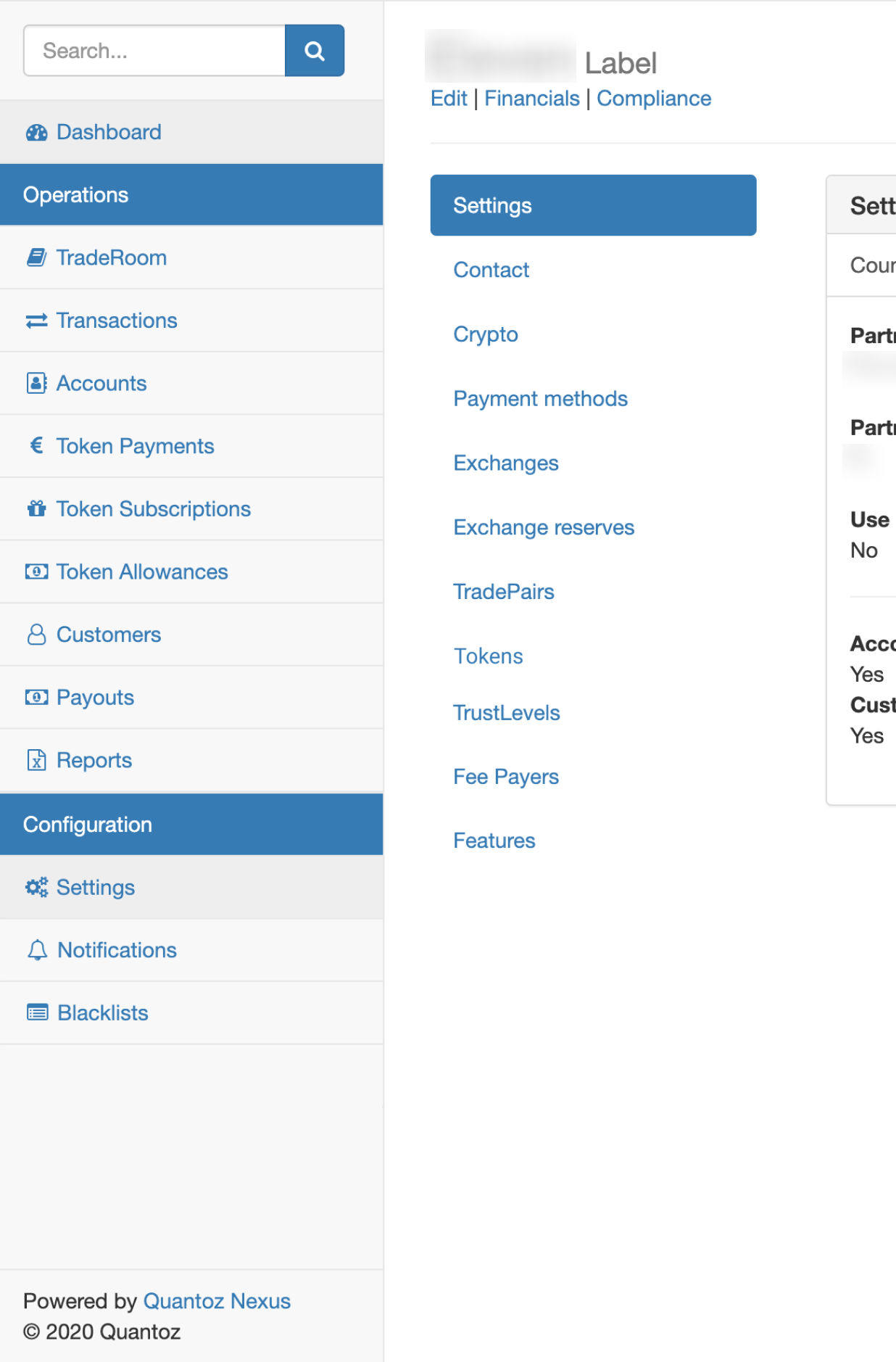 The initial definition of the Settings is part of the onboarding process, with Quantoz consultants supporting your administrators to find the optimal configuration to suit your needs. The behavior and functionality of the Nexus application is configured in the Settings tab (see image below).
