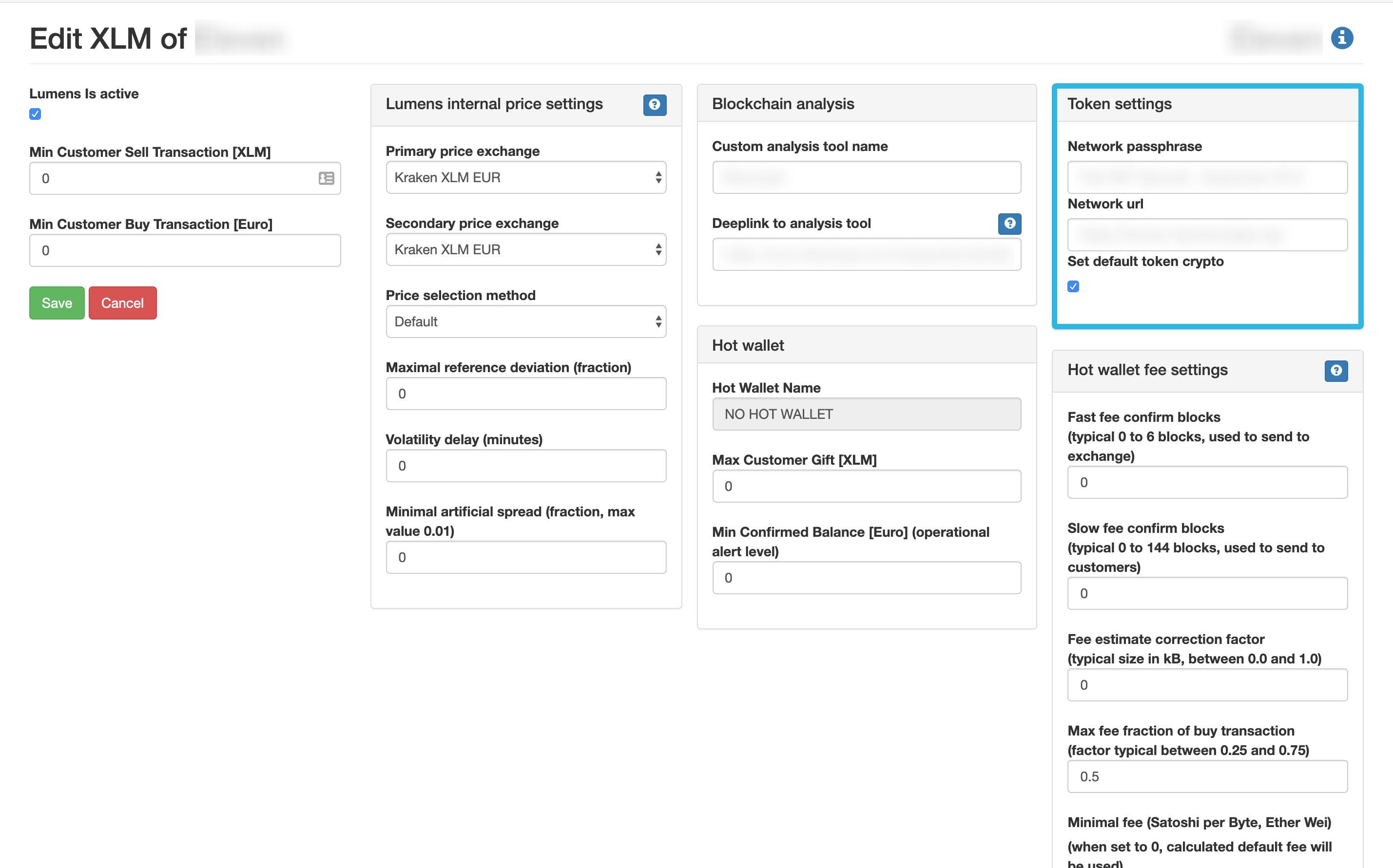 An overview of the available token blockchains is presented here. For each one of them, the administrator can set the native currency price parameters, transaction limits, blockchain analysis tools and the mining fees through the Edit button on the top right of each panel. An important section within the edit view is the Token settings panel, where the blockchain being used is defined (a Testnet, Prodnet of a public blockchain or a link to a private one as well).